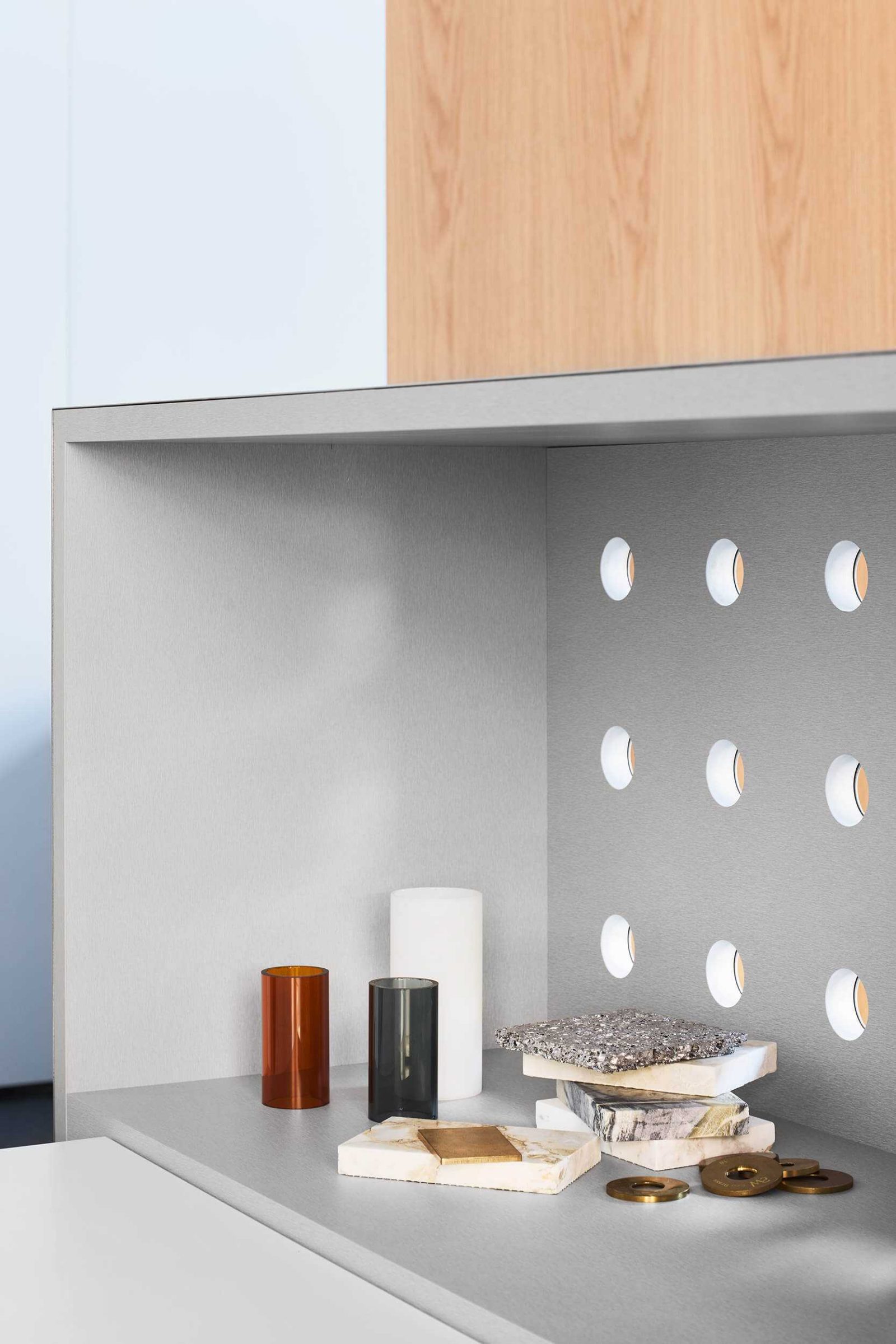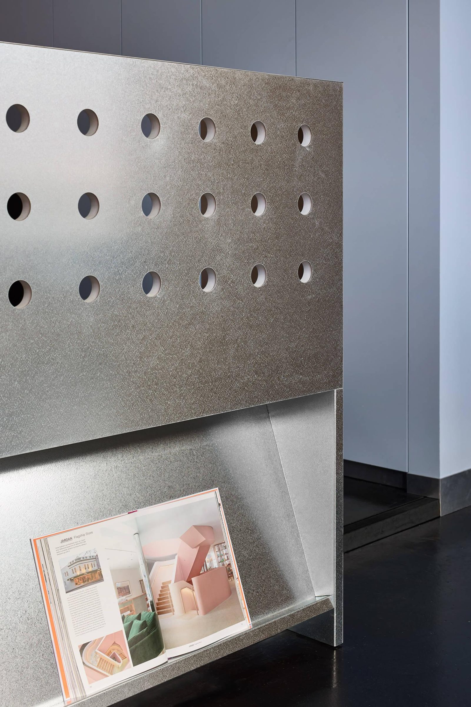 Open-plan workspaces are articulated by a galvanised steel partition and subtle changes in floor level. Circular perforations within the partition balance privacy with visual connection across the studio. On one side, a low-angled shelf presents a curated library of published projects; opposite, a desk-height shelf displays objects integral to the design process, including prototypes, material samples, and reference texts.