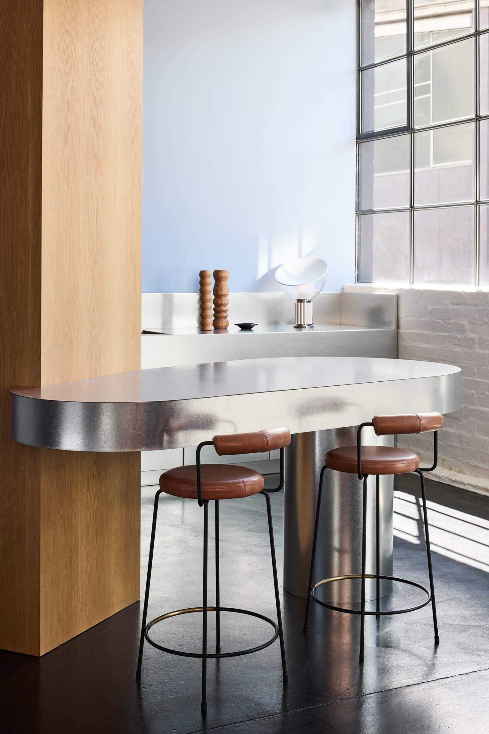 The informal meeting and kitchen area is realised as a composition of freestanding joinery. A pantry and fridge volume in American oak veneer is detached from the perimeter, forming a clear object within the plan. From this volume, a cantilevered galvanised steel island extends into the room, complemented by a matching steel bench along the rear wall. Together, these elements test an alternative arrangement that supports flexibility, material contrast, and use beyond a single function.