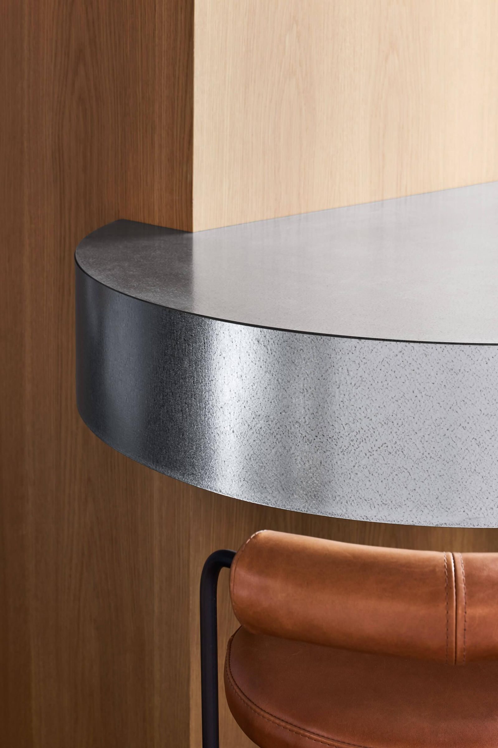 Both the conference table and the cantilevered island employ a teardrop geometry—a strategy originally developed through earlier hospitality work and further tested within the studio. Refined here, the form subtly directs orientation and use, ensuring clear sightlines to presentations in the meeting space while encouraging intuitive movement and occupation around the bench.