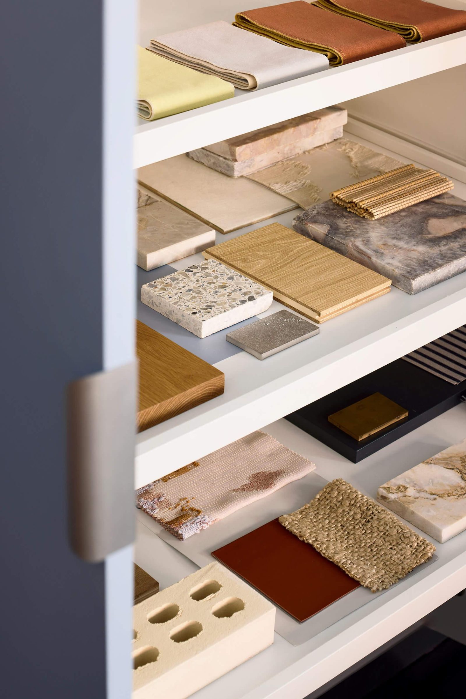 A cork-clad joinery volume introduces a strong vertical element, providing a dedicated space for traditional pin-ups and collaborative review. Concealed flexible shelving supports material testing, sample storage, and ongoing design development, allowing the studio to remain visually clear while accommodating an active, iterative process.